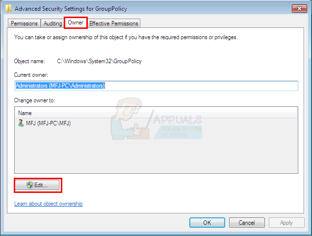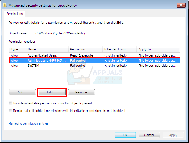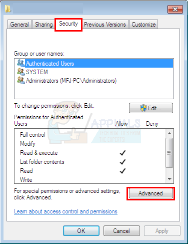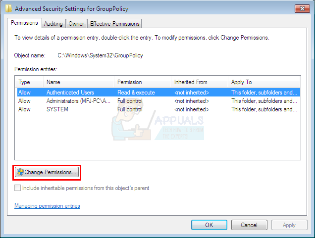 - Now, you should be back at the Advanced security settings window. Select the Permissions tab