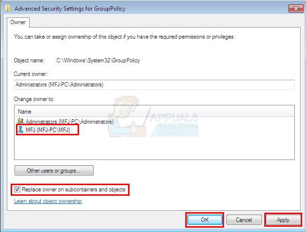 - Check the box that says Replace owner on subcontainers and objects