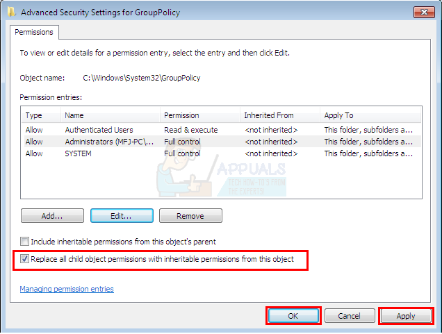 - Check the option Replace all child object permissions with inheritable permissions from this object
