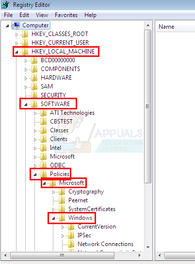 - Now, go to the HKEY_LOCAL_MACHINE\SOFTWARE\Policies\Microsoft\Windows If you don’t know how to navigate to this position then follow the steps given below