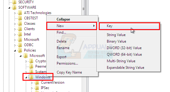 - Right click Windows from the left pane and select New then select Key