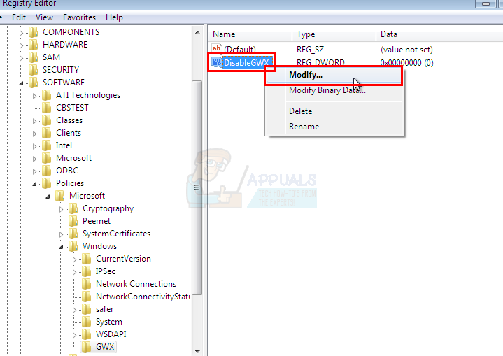 - Now, Right click the newly create DisableGWX entry and select Modify