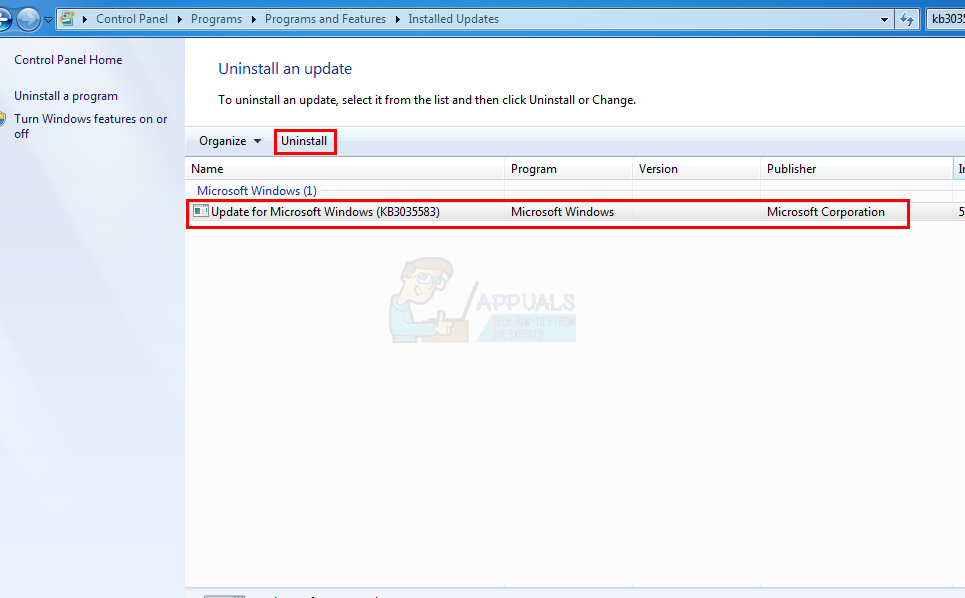 - Select KB3035583 update and click Uninstall