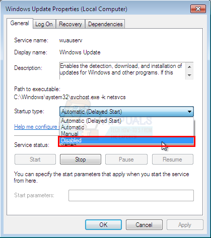 - Select either Manual or Disabled from the drop down menu in Startup Type section