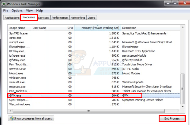 - Right click GWX.exe and click End Process