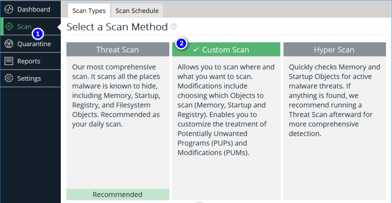 Select your language, accept the EULA agreement and go ahead with the installation. After setup finishes installation, Malwarebytes will launch, and start checking for updates. Once it has finished checking updates click the Scan Option and choose Custom Scan.