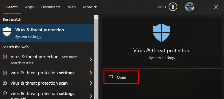 - Open ‘Virus & threat protection‘ using the Search bar.