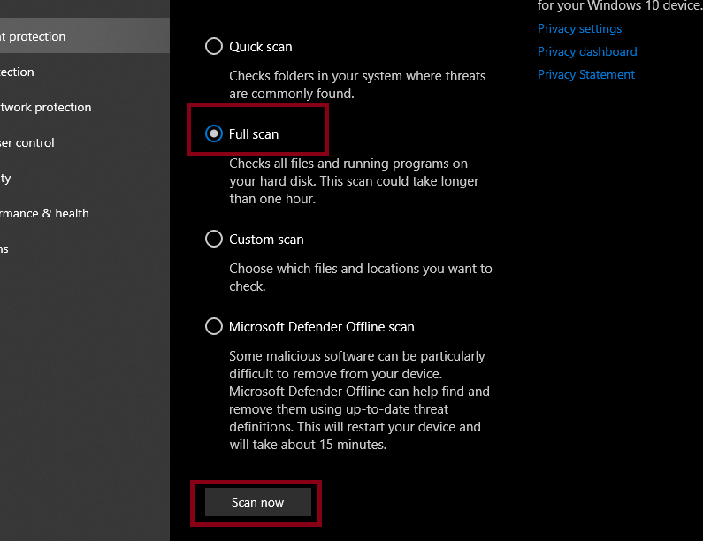 - Choose Full scan and then click Scan now.