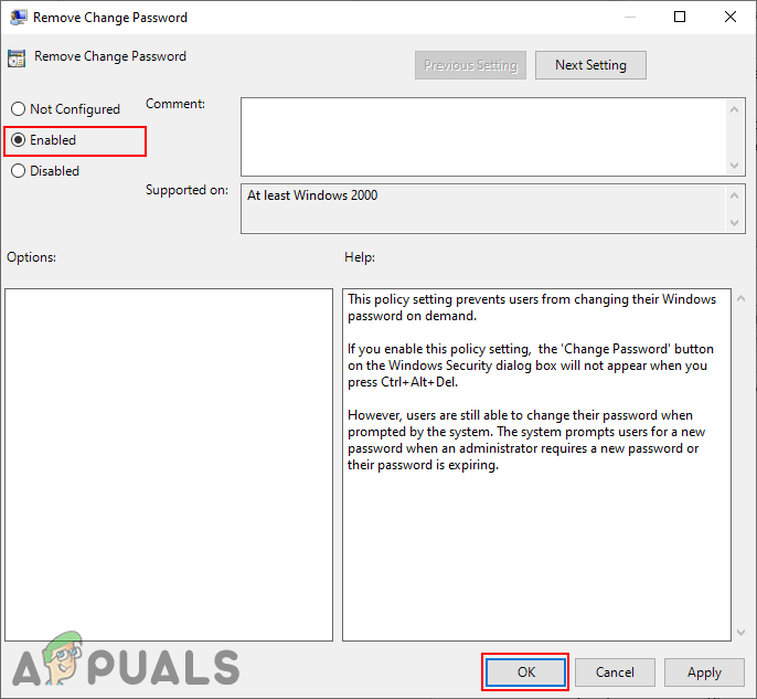 - For removing the change password option double-click on the “Remove Change Password” setting. It will open another window, change the toggle from Not Configured to Enabled. Finally, click on Apply/Ok to save the changes.
