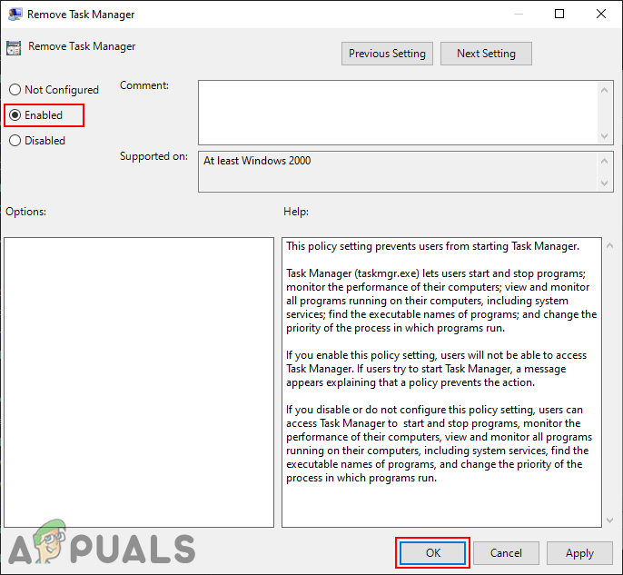 Removing lock computer option - For removing the Task Manager option from the list of Ctrl + Alt + Del, double-click on the “Remove Task Manager” setting. It will open a new window where you can change the toggle from Not Configured to Enabled. To save the changes, click on Apply/Ok buttons.