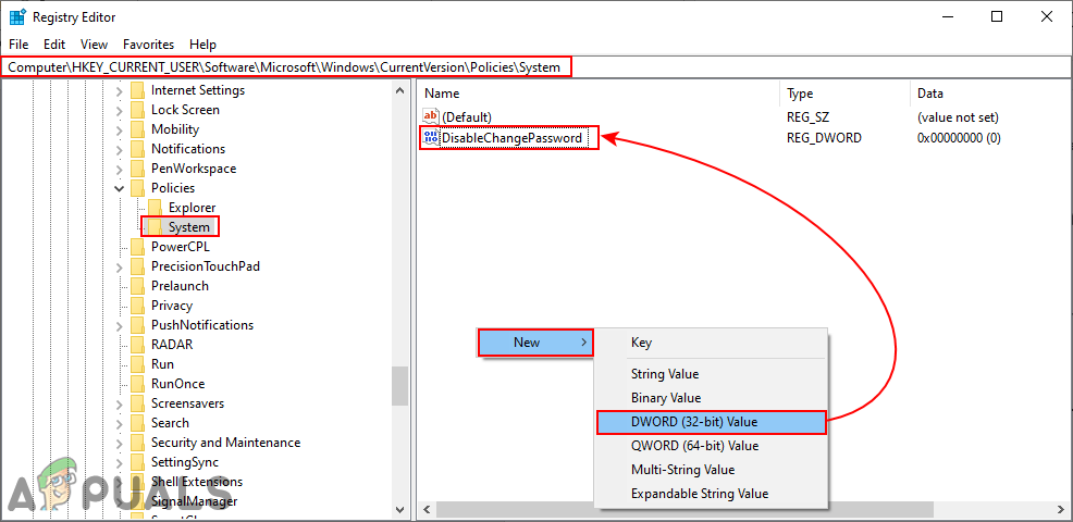 Creating the missing key - To remove the change password option, select the System key, right-click on the right pane, and choose New > DWORD (32-bit) Value. Name the new value as “DisableChangePassword“.