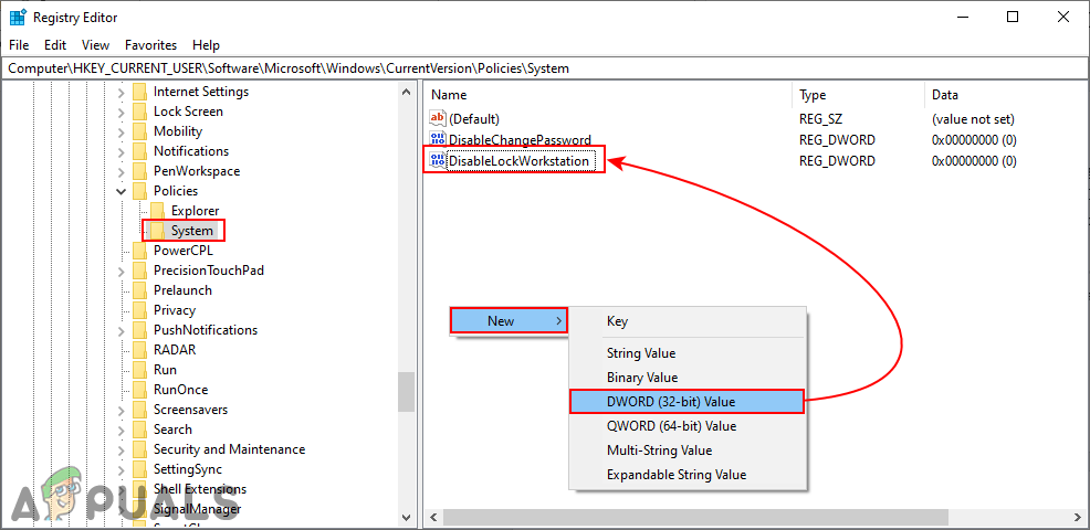Changing value data - If you want to remove the lock option, then right-click on the empty area of the right pane and choose New > DWORD (32-bit) Value. Name this value as “DisableLockWorkstation“.