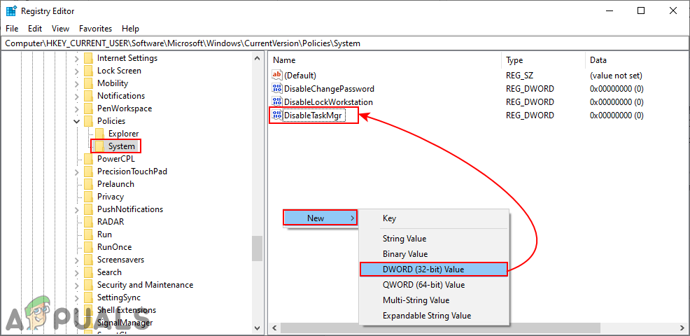 Enabling the value - To remove the Task Manager option from the system, right-click on the right pane and choose New > DWORD (32-bit Value). Name the newly created value as “DisableTaskMgr“.