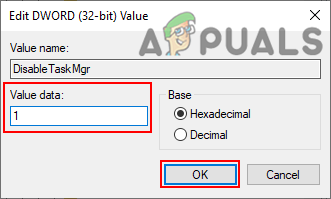 Creating value for removing Task Manager - Double-click on the DisableTaskMgr value to open it. Now change the value data to 1. This will remove the Task Manager.