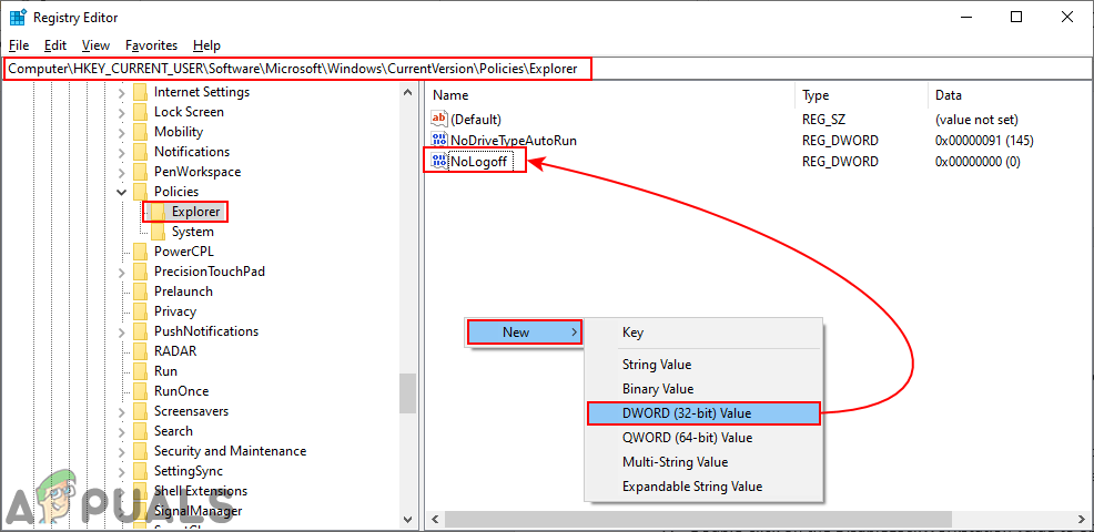- If the Explorer key is missing, simply create it by right-clicking on the Policies key and choosing New > Key. In the Explorer key, create a new value by right-clicking and choosing New > DWORD (32-bit) Value. Name the value as “NoLogoff“.