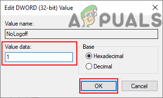 Creating value for removing the Log off option - Double-click on the NoLogoff value and set the value data to 1. It will remove the Sign Out option.
