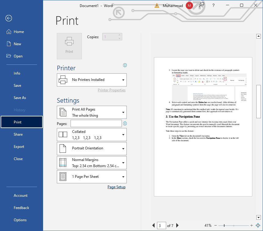 - Go to the File tab and select Print from the left pane to open Print Preview.