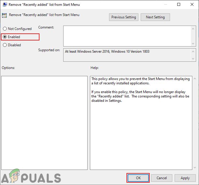Navigating to the policy setting - Double-click on the setting named “Remove “Recently added” list from Start Menu” and it will open up in another window. Now change the toggle option from Not Configured to Enabled.