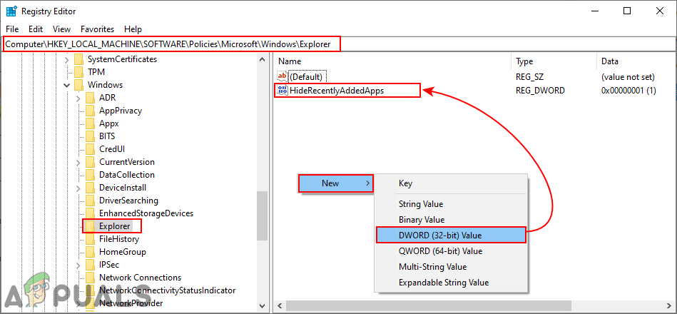 - In the Explorer key, right-click on the right pane and choose New > DWORD (32-bit) Value. Save this value by naming it as “HideRecentlyAddedApps“.