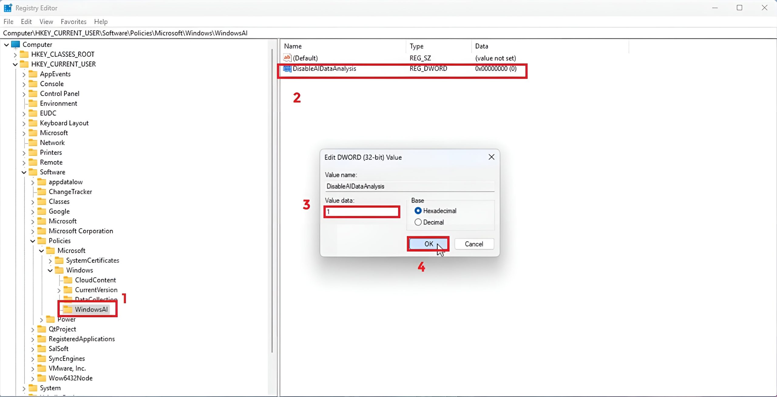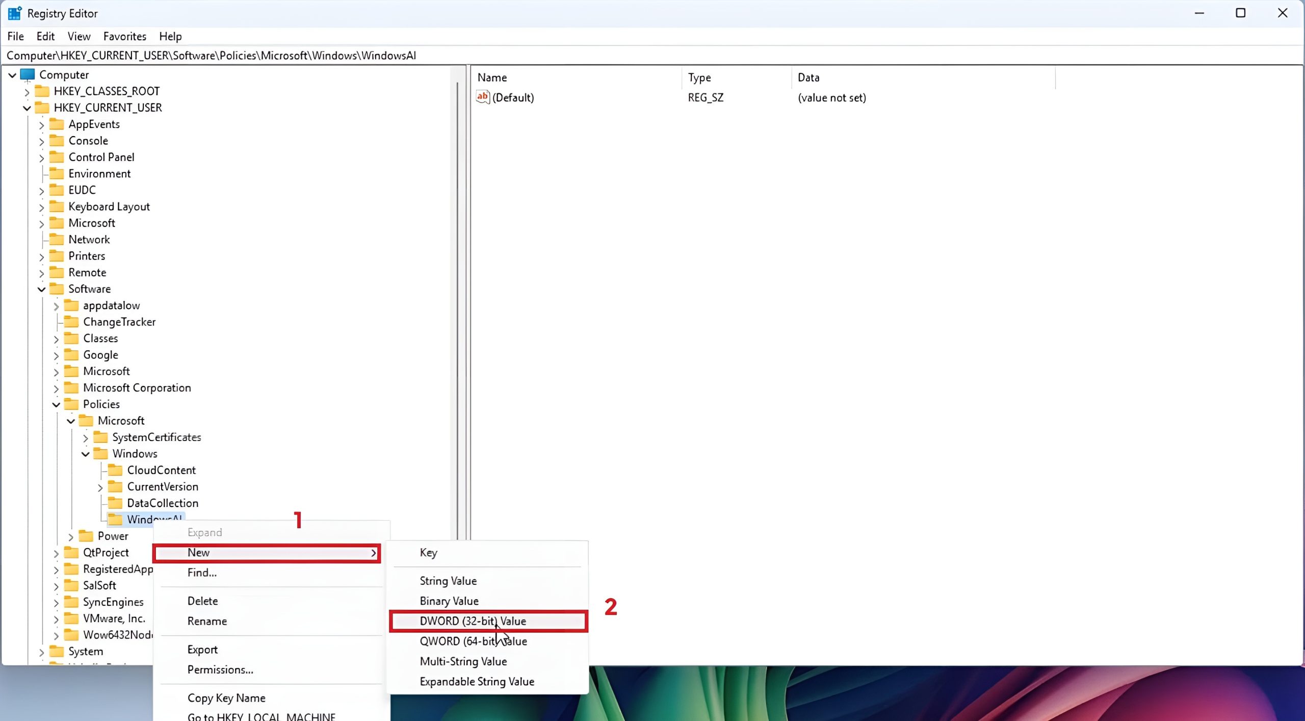 - Right-click on Windows AI → New → DWORD (32-bit) Value to create a subkey.