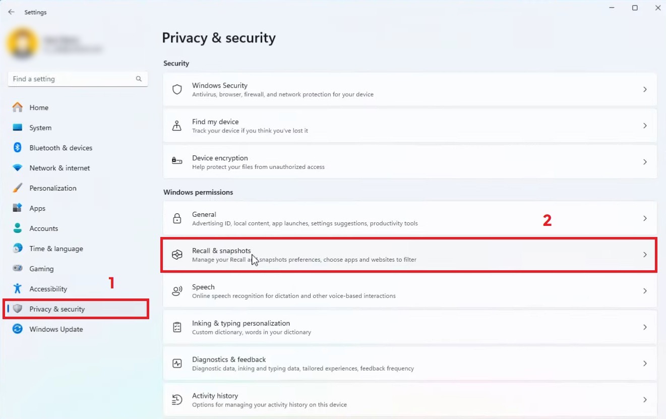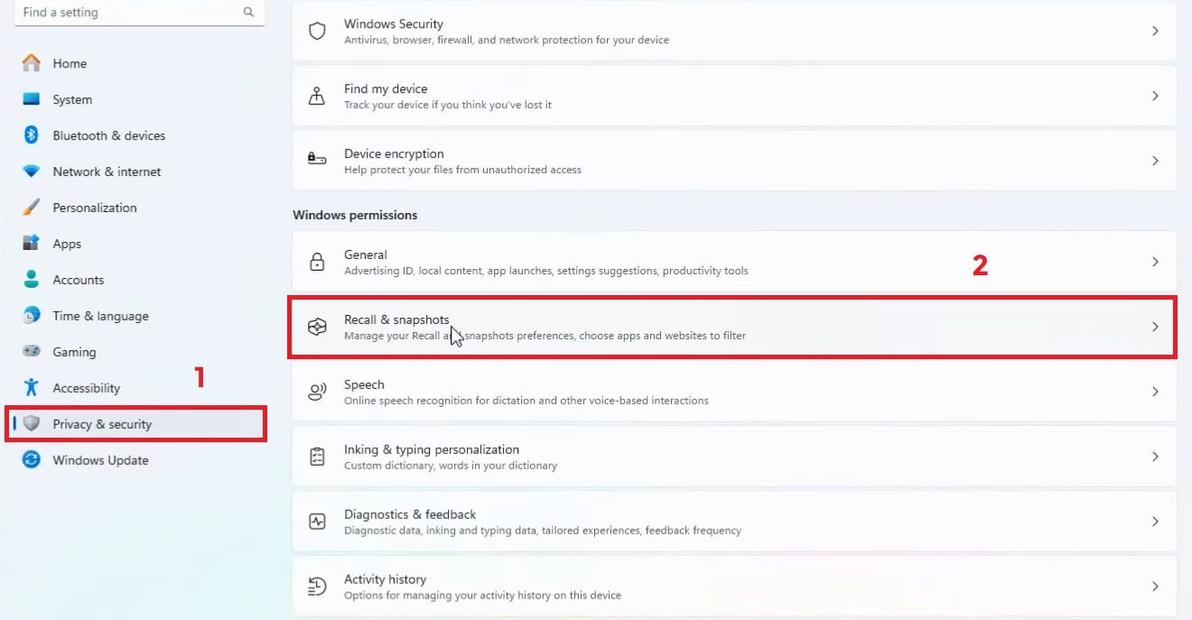 - Go to the “Privacy & Security” section and click “Recall snapshots.”