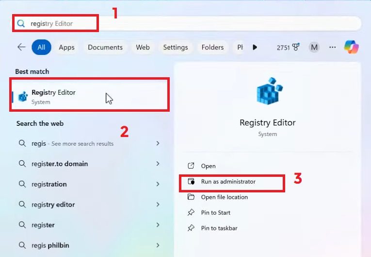 - Open the Start menu, search for Registry Editor, and run it as administrator.