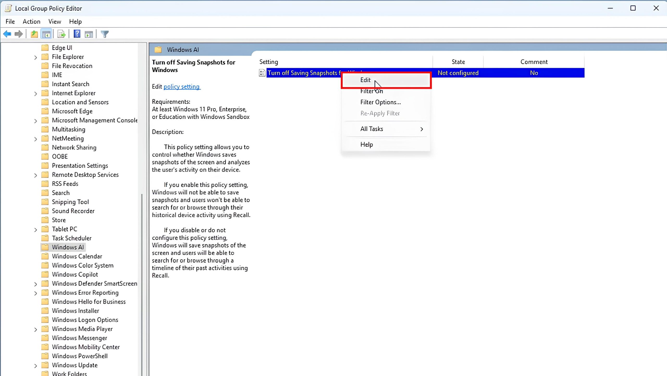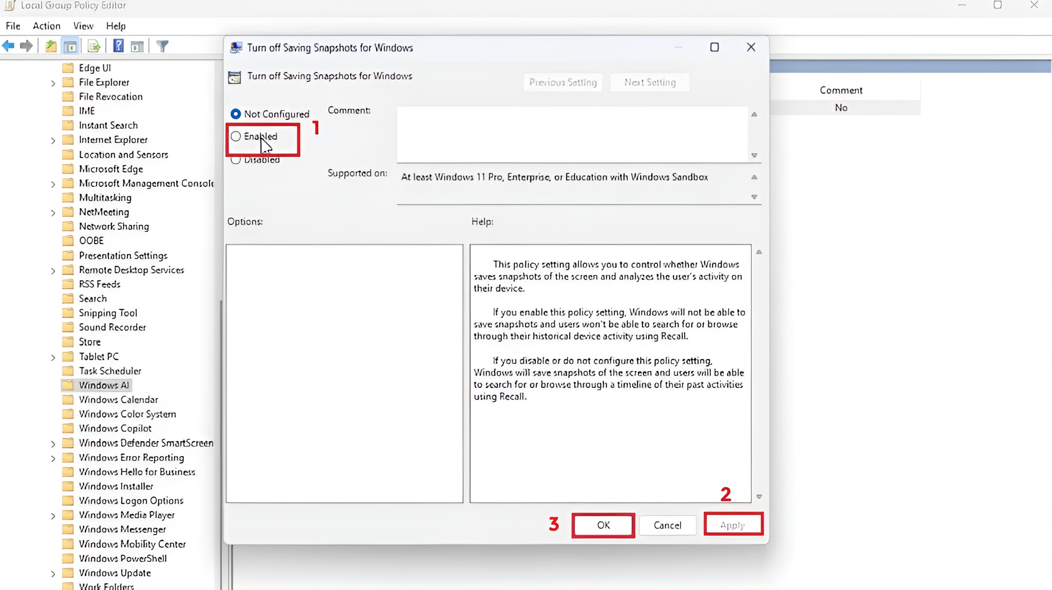 If you’re using Windows 11 Pro, Enterprise, or Education, the Group Policy Editor offers a more permanent solution. Disabling Recall here tells the system to block it at the operating system level, ensuring it won’t re-enable even after a restart or update.