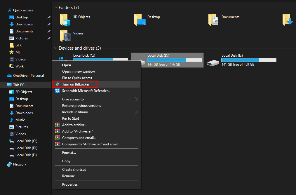 - Right-click on the problematic drive and select Turn on BitLocker.