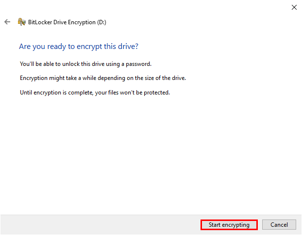 - Finally, click on Start encrypting. BitLocker will be enabled after some time, depending on the size and speed of your drive.