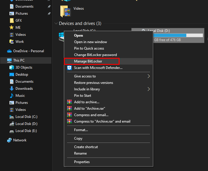 - Right-click on the drive again and select Manage BitLocker.