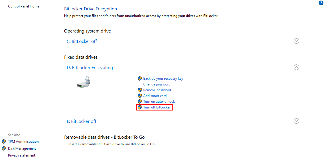 - Click on Turn off BitLocker and confirm by clicking Turn off BitLocker again.