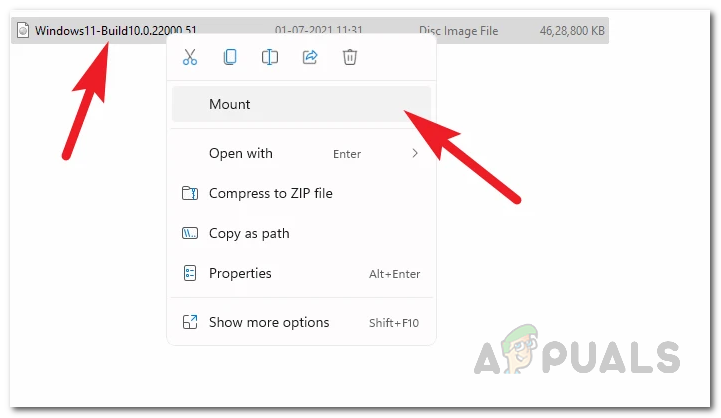 - First of all, go ahead and mount your ISO image. To do this, simply navigate to where your ISO file is located, right-click on it and then choose Mount from the drop-down menu. Alternatively, if you have a bootable USB drive, go ahead and connect it to your computer.