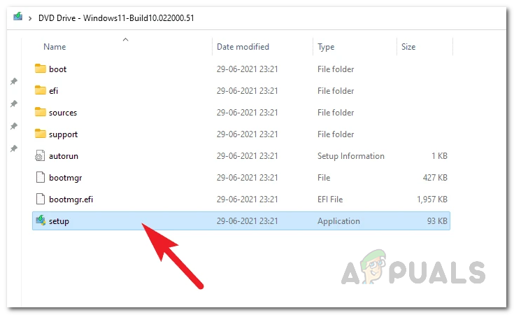 Mounting Windows 11 ISO - After that, navigate to the mounted drive using the File Explorer and then double-click the setup.exe file located inside.