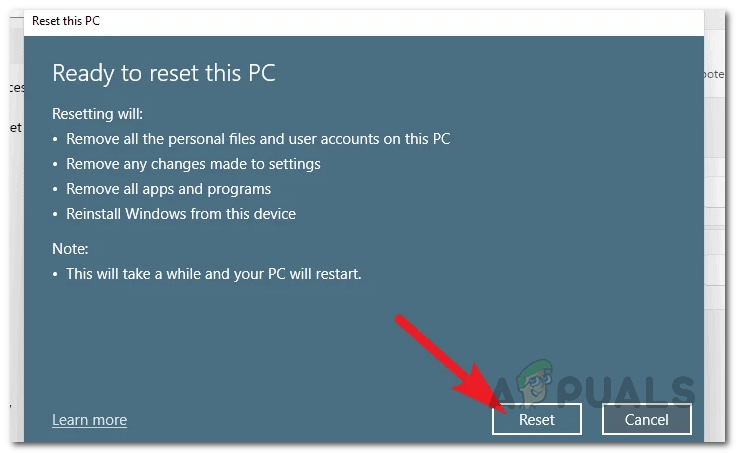Reset Settings - Finally, on the Ready to reset this PC screen, go ahead and click the Reset option to start the repairing process. This will take time depending on the settings that you have chosen so far so make sure to wait for it. In addition, your PC will be rebooted during this process so don’t worry if you see your system restarting. It’s all intended.