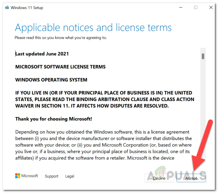 Windows 11 Setup License Agreement - Now, the Windows setup might check for updates again so wait for it to finish. After the updates have been downloaded, the setup will configure itself. Wait for it to finish.