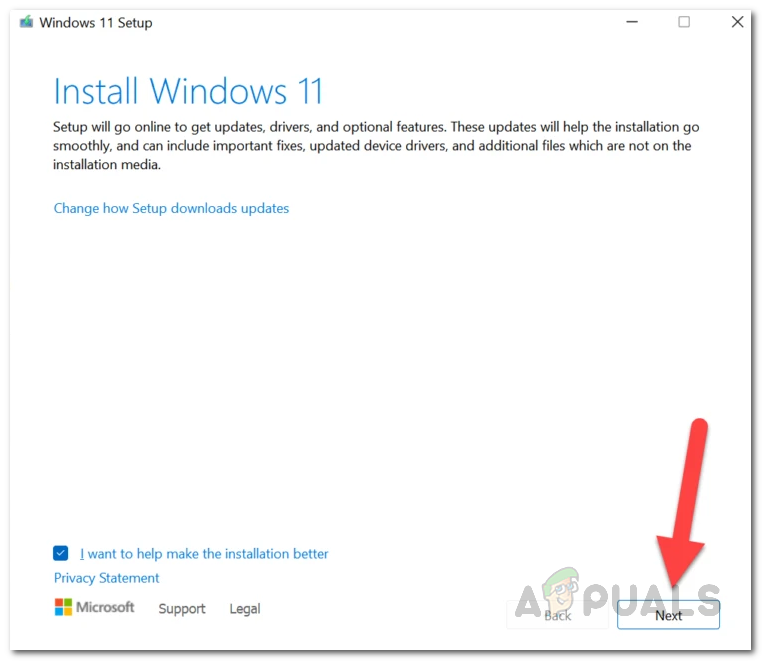 Running Setup.exe - This shall open up the Windows 11 Setup window. Click the Next button at the bottom-right corner of the setup window.