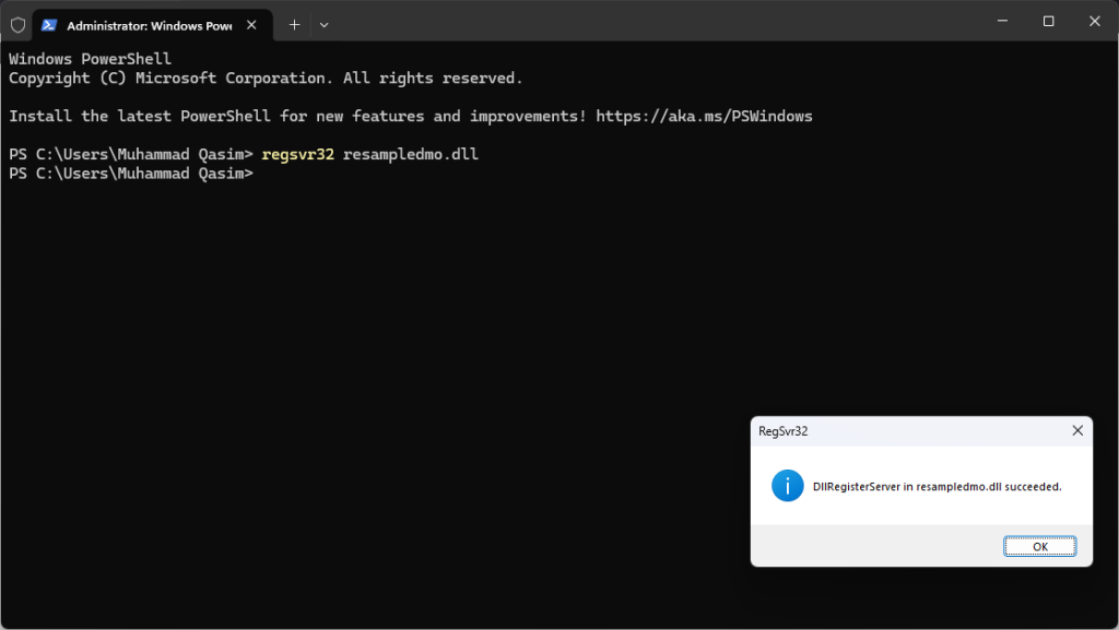- Type regsvr32 resampledmo.dll, and press Enter.