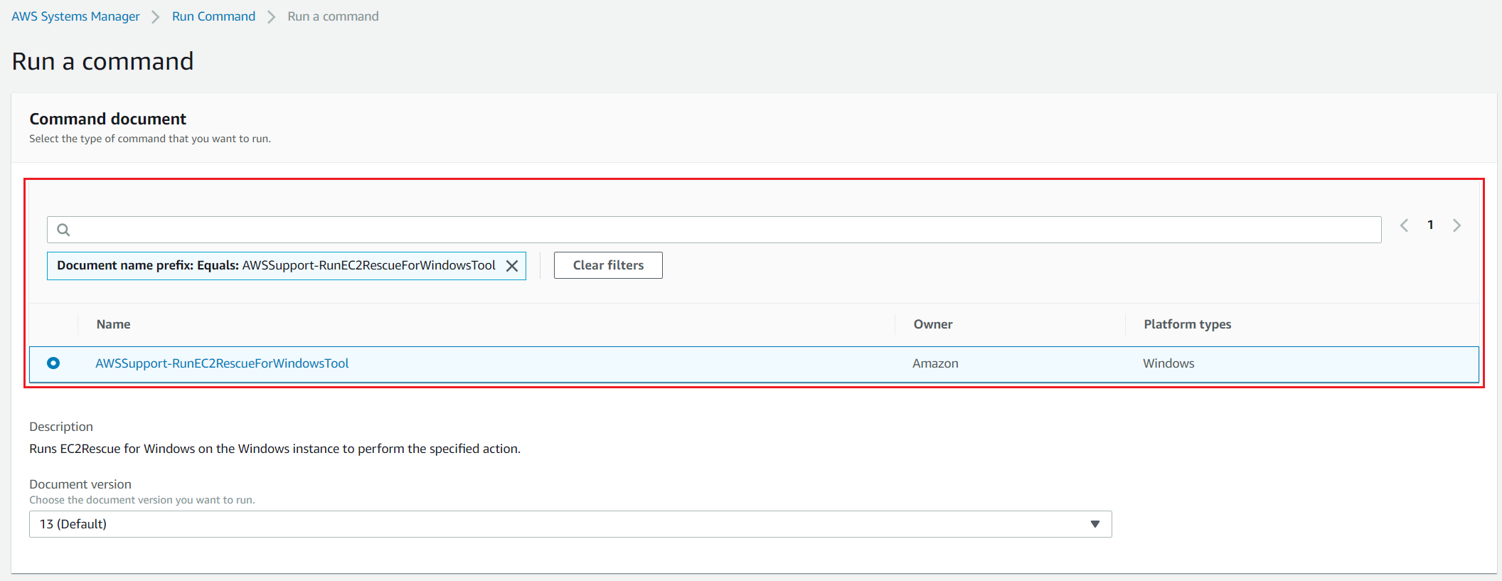 - Choose AWSSupport-RunEC2RescueForWindowsTool under Command document. You can type it in the search field and press Enter.