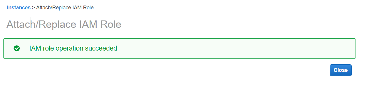 - You have successfully attached the IAM role to instance. Click on Close. This process can take up to 5 minutes, for instance, to register itself with the AWS System Manager service.