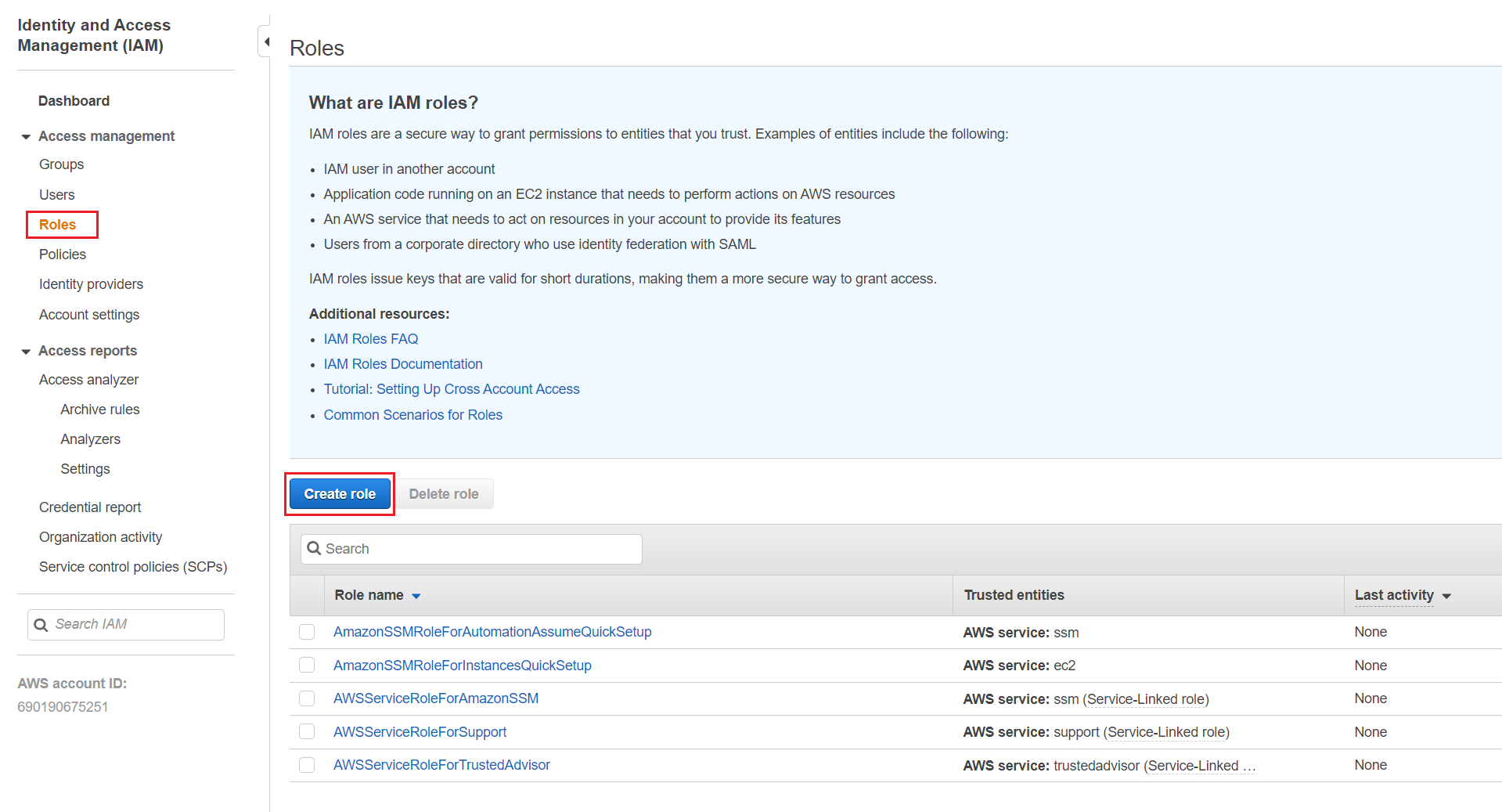 - Click on Roles under Access Management under navigation panel and then click on Create role