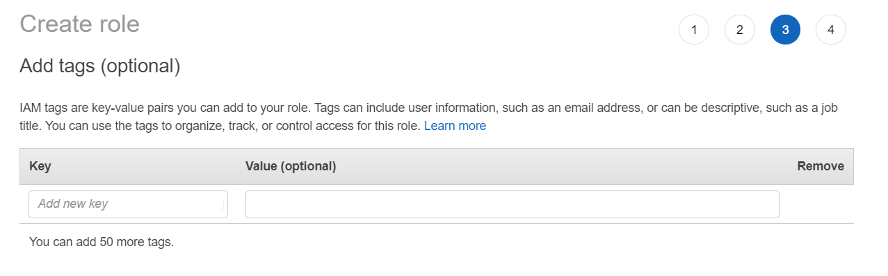 - Create key pairs to your role and then click on Next: Review. Tags can include user information, such as an email address, or can be descriptive, such as a job title. You can use the tags to organize, track, or control access for this role. As this is optional, we will skip it.