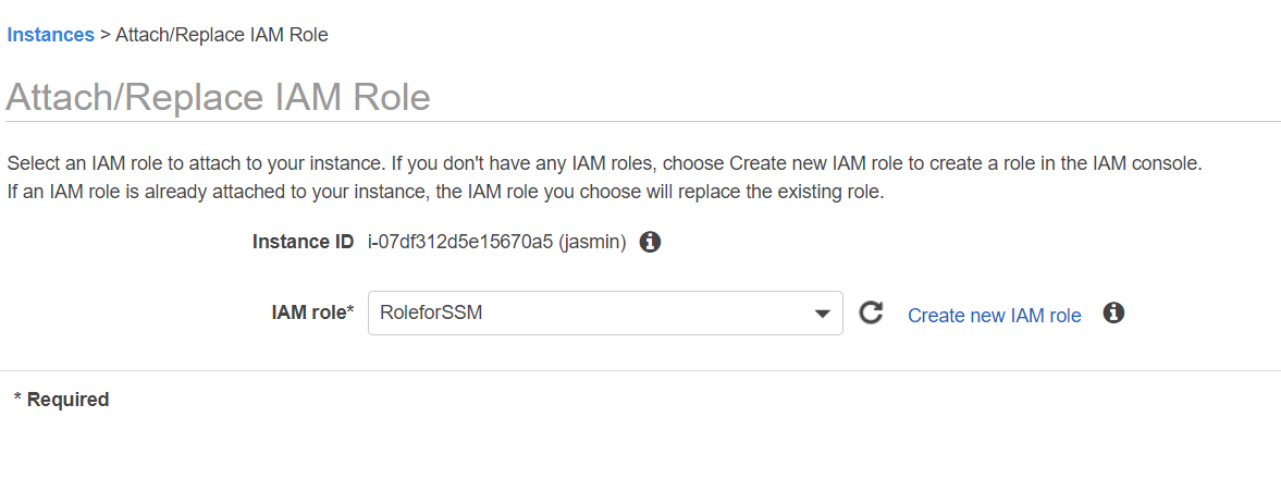- Under Attach/Replace IAM Role choose an IAM role and click Apply. As you can see we choose IAM Role that we created in step 1: RoleforSSM.