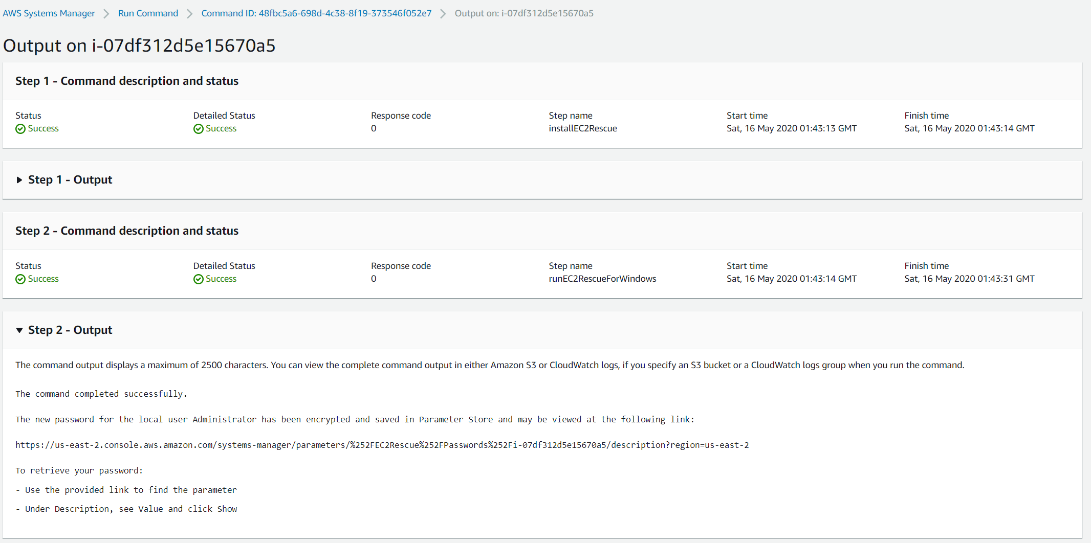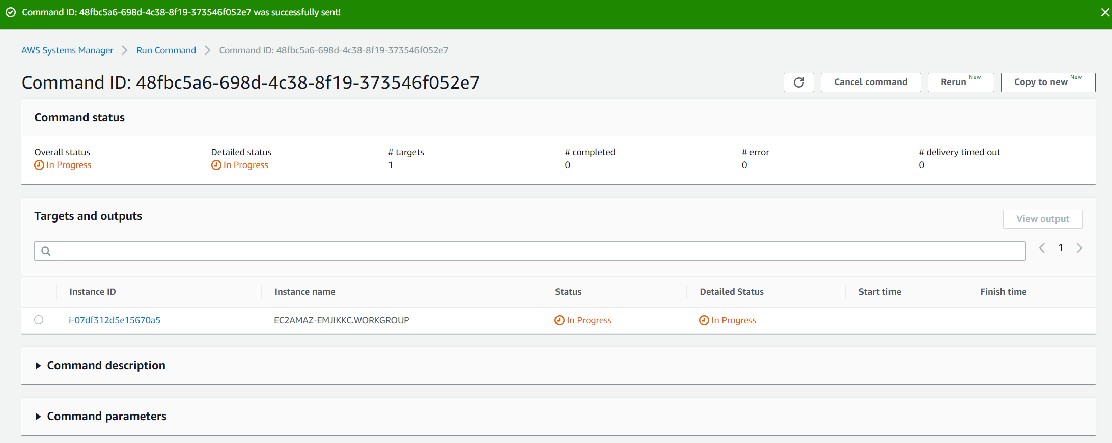 - Under Target and outputs select the instance and then click on View output. As you can see here, the command was executed successfully. Expand Step 2 – Output.