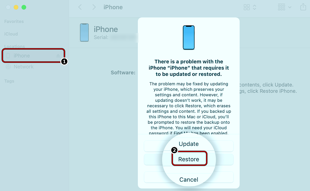 - Then on the “There is a problem with iPhone” pop-up message, click on the Restore button and follow the prompts to initiate the restore process.