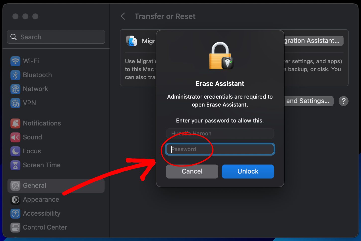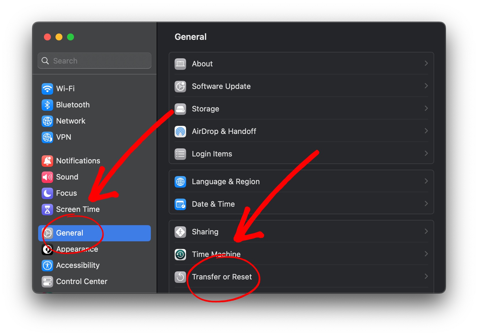 In the latest MacOS versions, System Preferences has been changed to System Settings in order to make it similar to the interface on the iPhone and iPad. Once you open System Settings, click on General, and then click on Transfer or Reset.