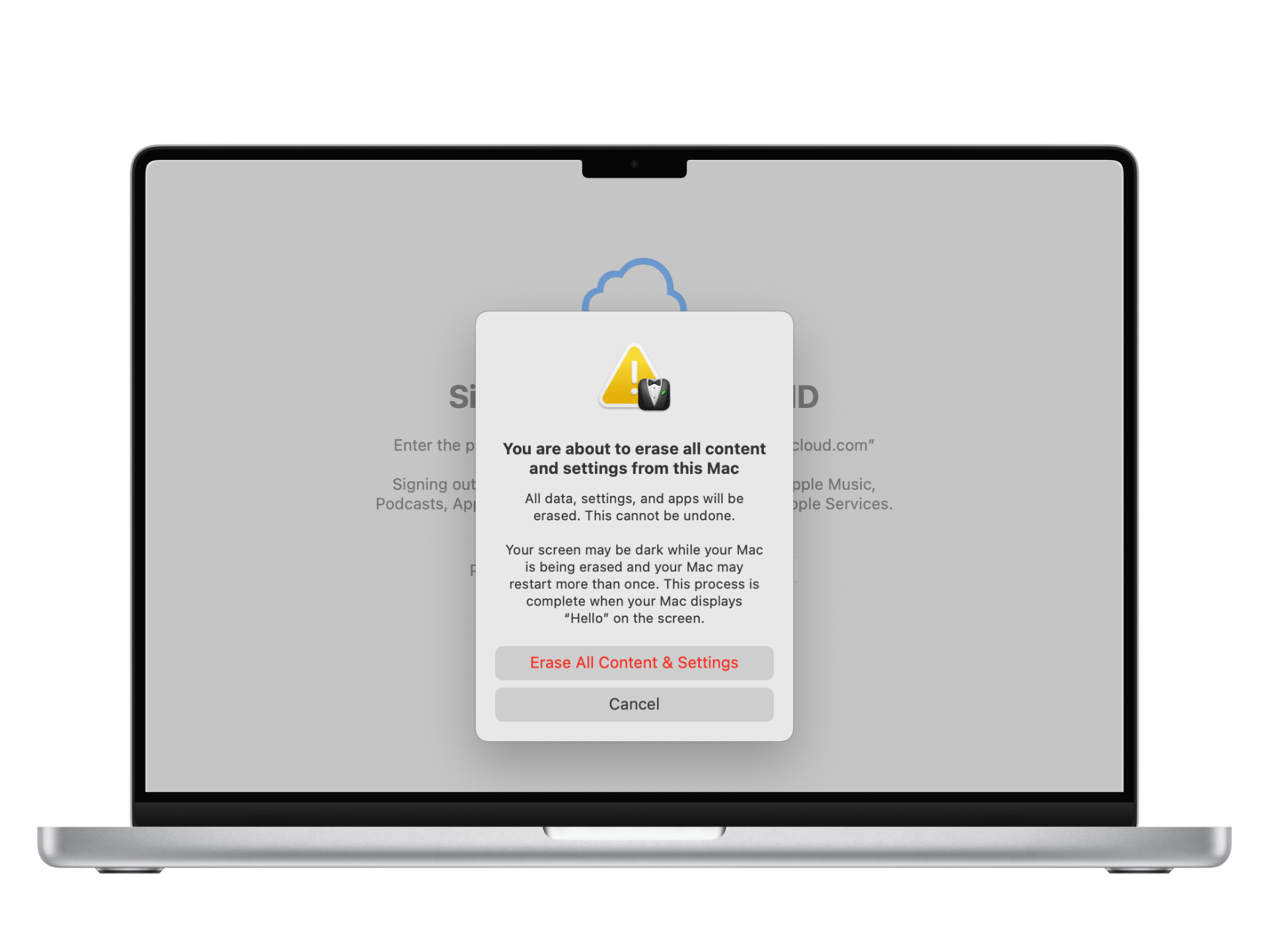 A final warning prompt appears on the screen, telling you that all data will be erased if you continue. Click on Erase All Content and Settings to proceed. Your MacBook Air will now be reset, and you can set it up as if it were brand new.