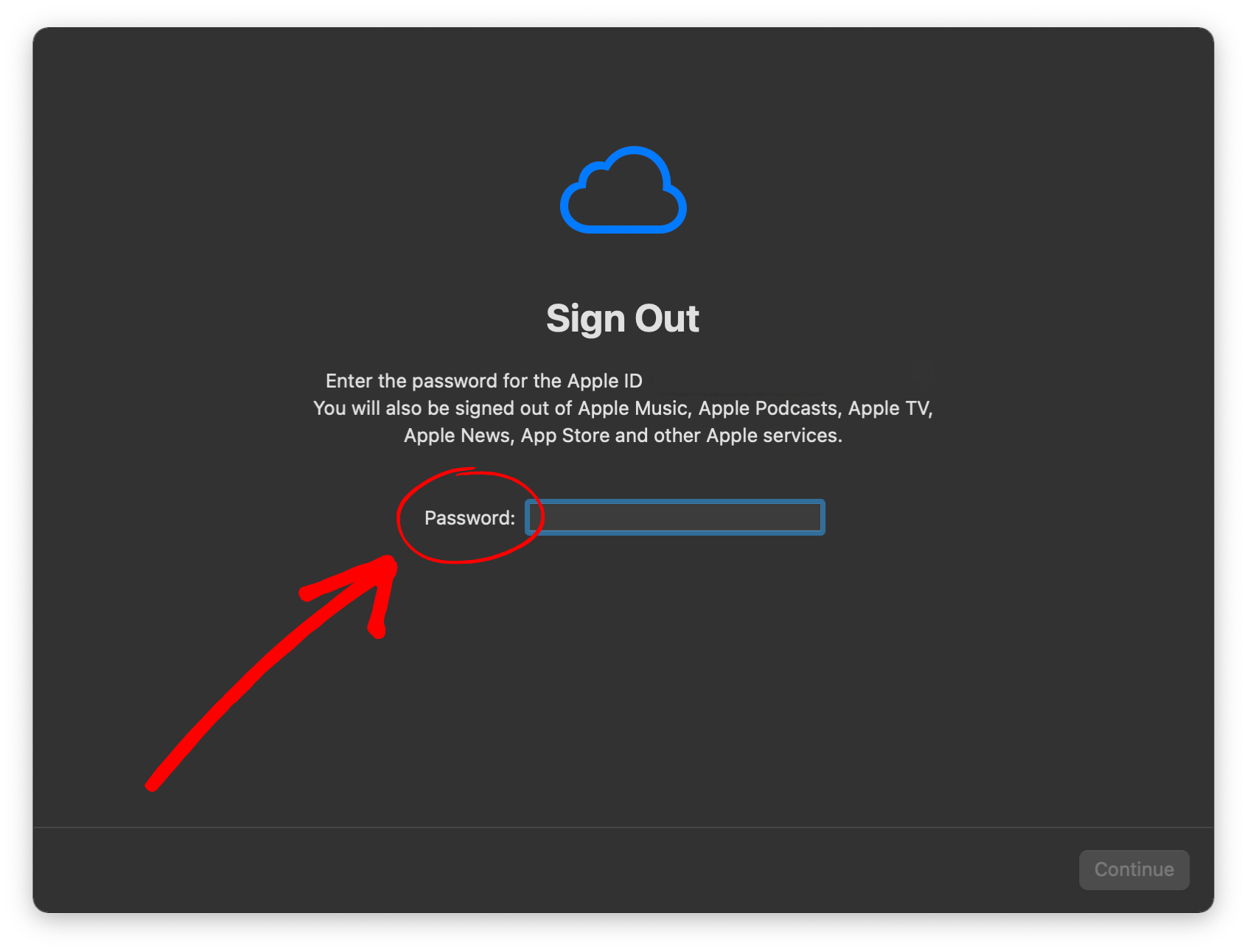 The final step before the process of resetting can begin is to sign out of your iCloud. On the new window that has opened, click on Continue, and then enter the password for the Apple ID logged in on the MacBook Air.
