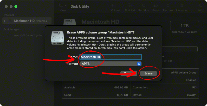 Within Disk Utility, click on the disk that has all of your data. Then click on the option to erase so that all of your data is deleted. Another box will appear; enter any name, but keep the format either AFPS or Mac OS Extended, as recommended by Disk Utility. Then click on Erase.