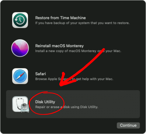 You now have a few options on your screen. You can restore from Time Machine, reinstall MacOS, use Safari to get help from Apple, and open Disk Utility. Click on this last option.