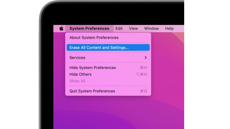The options on the toolbar where the Apple logo was located have now changed. Click on System Preferences on this toolbar, and in the drop-down menu, click on Erase All Content and Settings.
